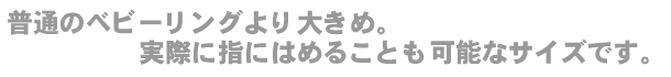 ![]() | 奥のいちばん大きなリングはママ用(10号サイズ)の指輪です。 右手前が「刻印のできるサイズの大きなハートのベビーリング(ピンクゴールド)」 縦:約18mm×横約16mm/内径13mm(1号サイズ) 左手前が一般的なベビーリングです。 (当店の刻印プリモベビーリング) 縦約10mm×横約10mm |